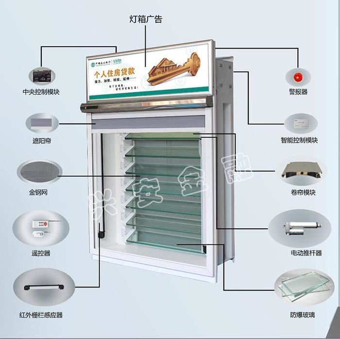 產(chǎn)品采用多層結(jié)構(gòu)并具有多重功能的窗體,從外到內(nèi)依次為:金剛網(wǎng)隱形紗窗層、復(fù)合簾片式卷簾窗層、防爆百頁窗層、無極遮陽簾層和紅外柵欄層和入侵報警系統(tǒng)。后窗的使用使業(yè)務(wù)辦公區(qū)通風(fēng)換氣、防盜采光、安全有保障!