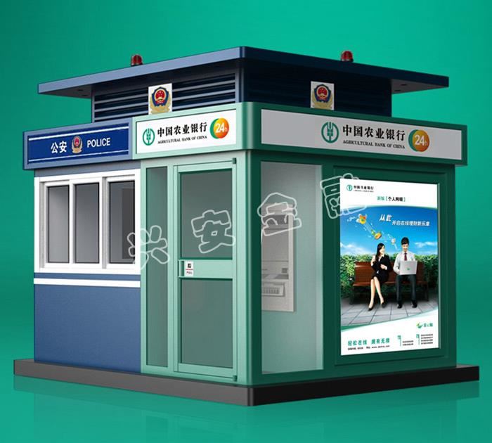 自助銀亭由五部分組成:加鈔區(qū)設備間、自助交易區(qū)、VI形象燈箱、底座、地基